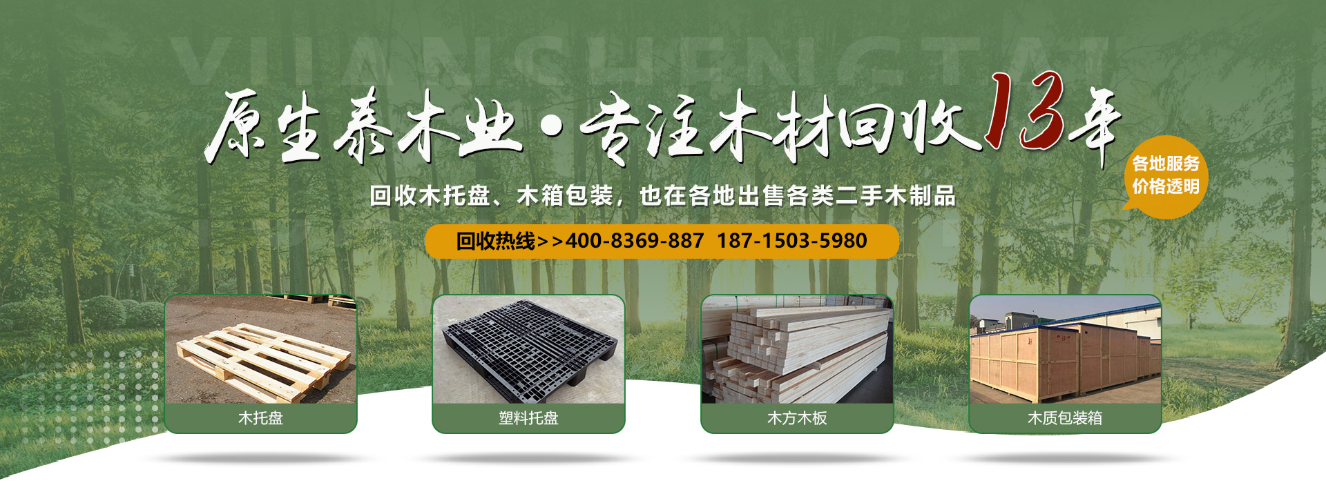 原生泰木業有限公司是一家服務各市的企業,本公司是以回收各類二手廢舊木材為主,主要回收各類木托盤、塑料托盤、木箱包裝、建筑木方木板、木棧板等等。本公司收購價格以托盤、木箱木材的規格、使用情形、新舊程度、材質為估價標準,如果您有意向出售您的閑置木制品以及塑料制品,請您聯系我們時告知其數量、尺寸、型式、使用情形,我們免費為您提供電話估價或到現場報價。本公司是一家經工商局嚴格注冊的正規木制品回收公司,回收木托盤、木箱包裝致力于環保建設、綠色合作以求雙贏。同時原生泰木業公司也對各地范圍出售二手木托盤、二手塑料托盤、各種二手木制品。及時送貨上門,價格公道。公司下轄木材加工廠,組裝廠,并備有大型標準烘房,多功能平板刨,壓刨,挖槽,機械設備等。產品主要生產各類木托盤、木包裝箱銷往國內大中型城市并隨貨通行出口國外。本公司將以豐富的知識,提供合適的方案來服務和滿足每一用戶不同的需求,品質至上,誠實守信。